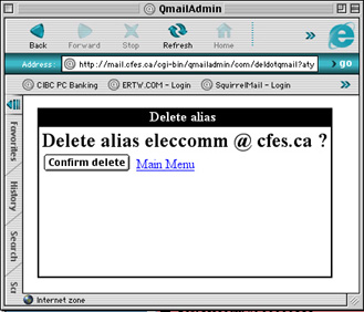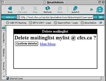 To delete a mailing list simply select Delete for the appropriate list. You will presented with a confirm page as shown where you can choose to confirm the deletion or return to the main menu.