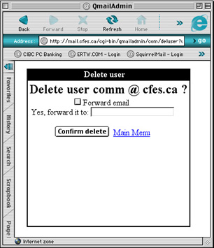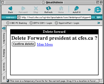As with deleting an alias if you delete an forwarding account you will be presented with a confirmation page which allows you to either confirm the deletion or cancel.