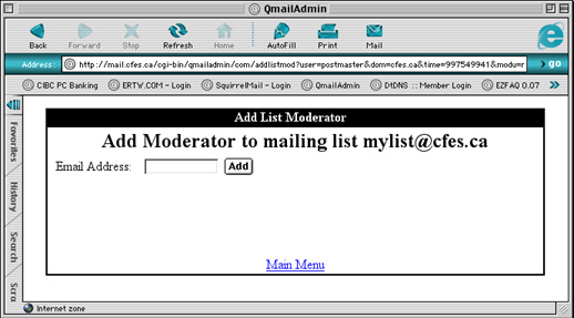 To add a moderator simply select the Add Moderator button for the appropriate list. This will present you with the following page: