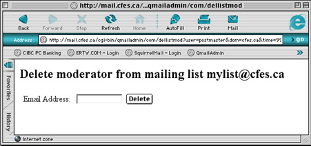 To delete a moderator simply select the Delete Moderator button for the appropriate list. This will present you with the following page:
