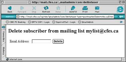 To delete a subscriber simply select the Delete Subscriber button for the appropriate list. This will present you with the following page: